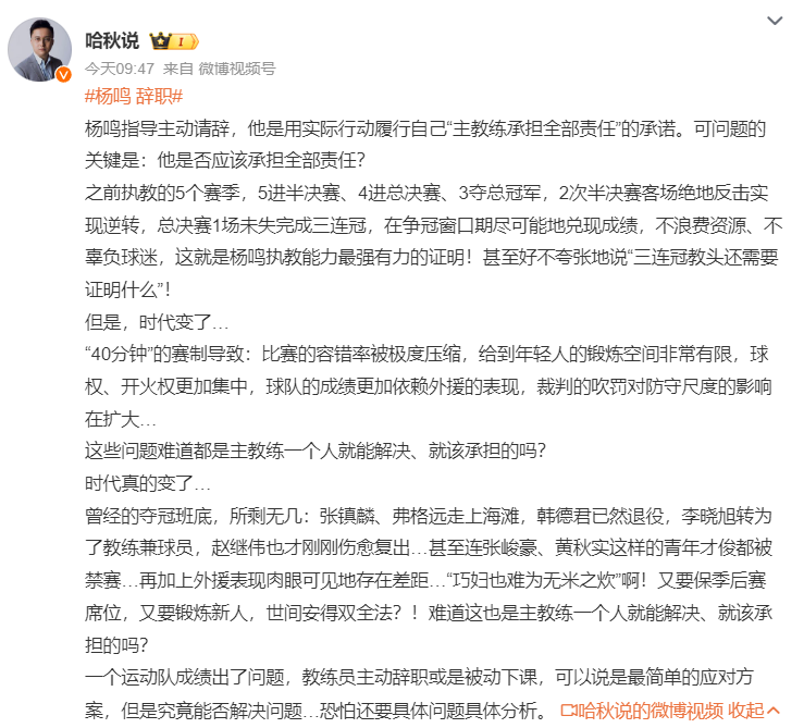 哈秋:杨鸣该为辽篮承担全部责任吗?在争冠窗口期兑现成绩,不浪费资源、不辜负球迷,杨鸣的执教能力是得到一致认可的,毫不夸张的说三连冠教头还需要证明什么?